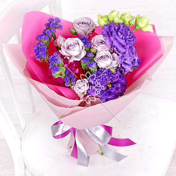 Роза кустовая светло-сиреневая - 1шт., эустома фиолетовая  - 1 шт., гвоздика сиреневая –  1 шт., статица фиолетовая –  1 шт., упаковка.