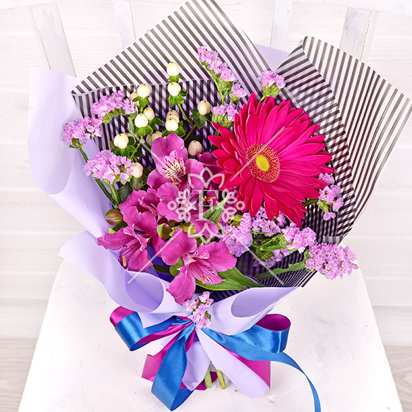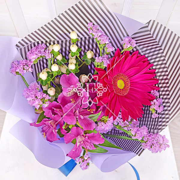 гербера малиновая – 1 шт., альстромерия сиреневая (фиолетовая) – 1 шт., гиперикум белый – 1 шт., статица сиреневая – 1 шт., упаковка, лента.